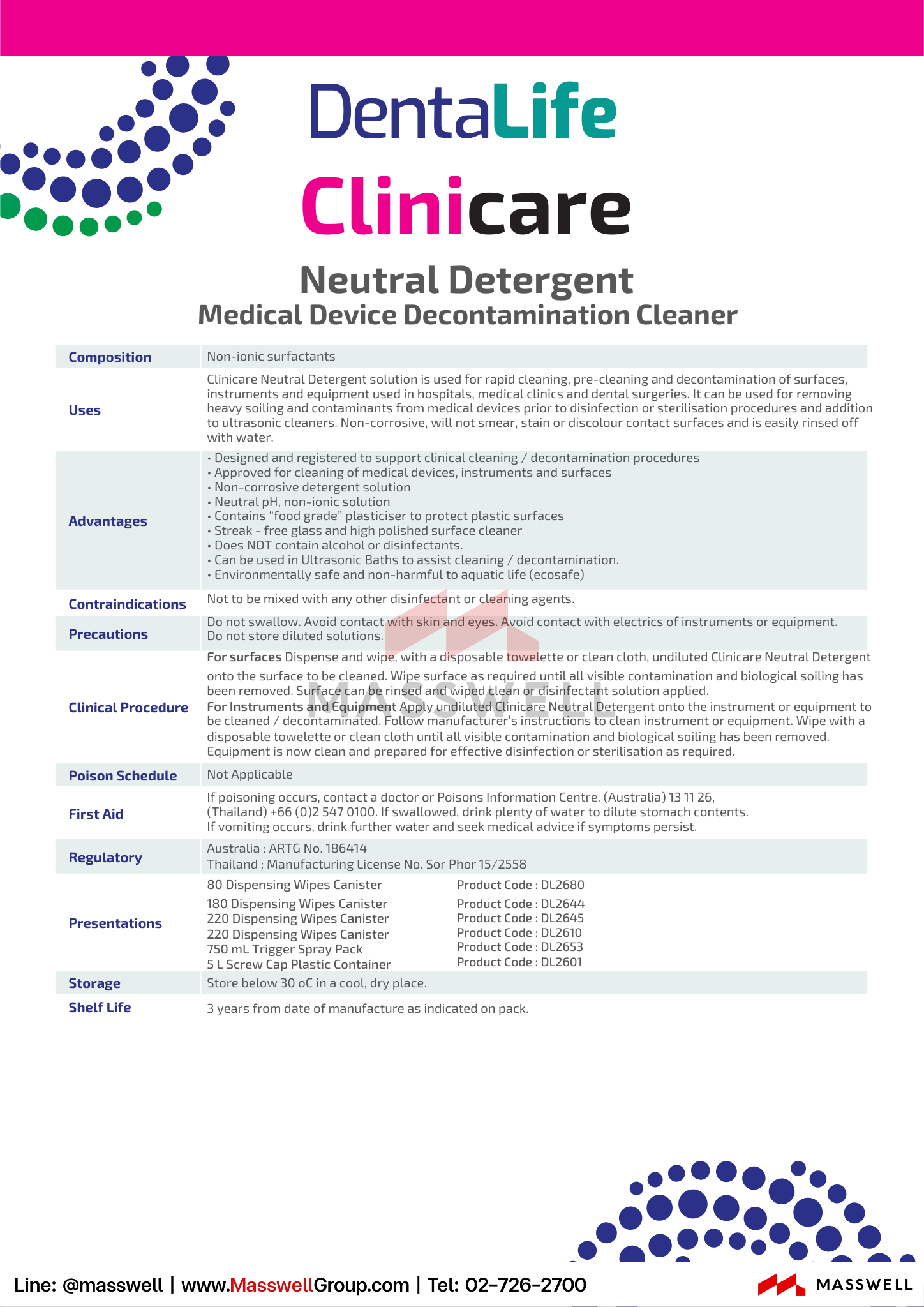 • สามารถเช็ดทำความสะอาดได้ทุกพื้นผิว เครื่องมือแพทย์ เครื่องมือทันตกรรม และอุปกรณ์ทางการแพทย์